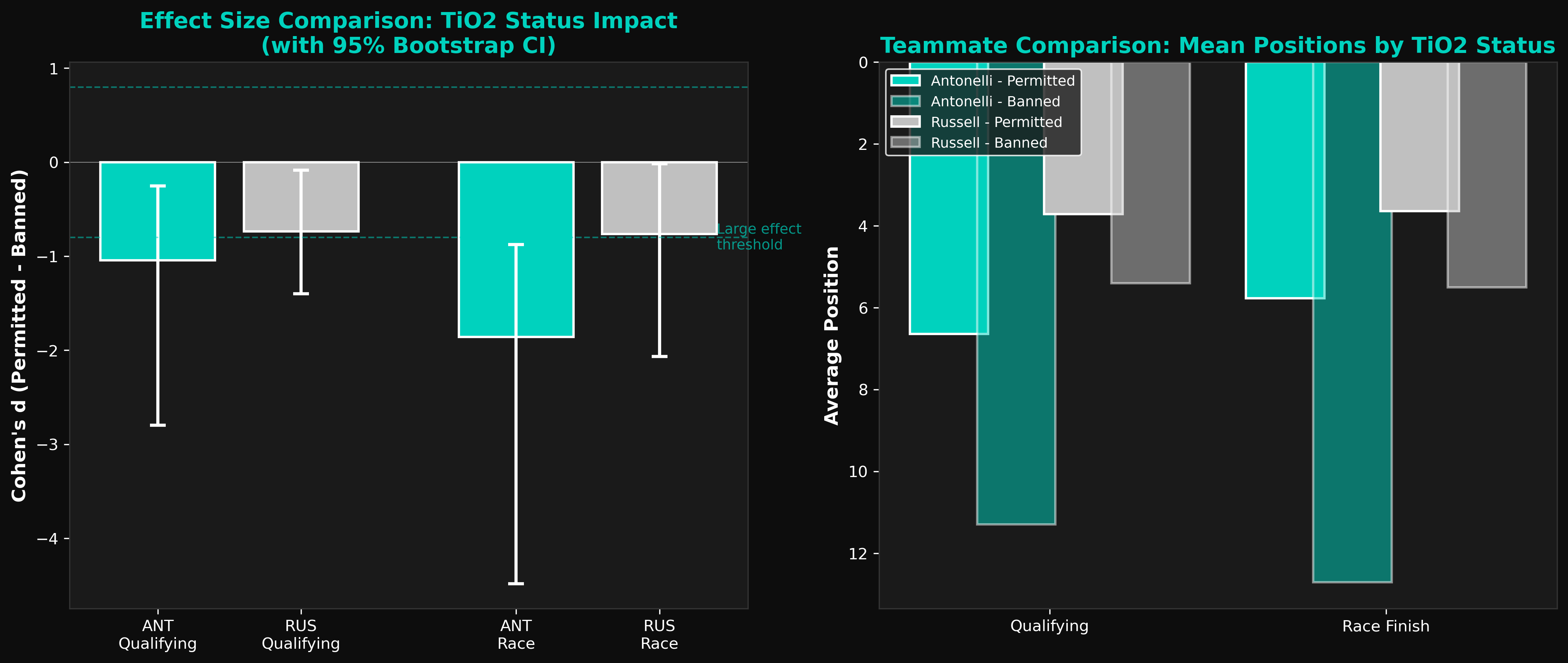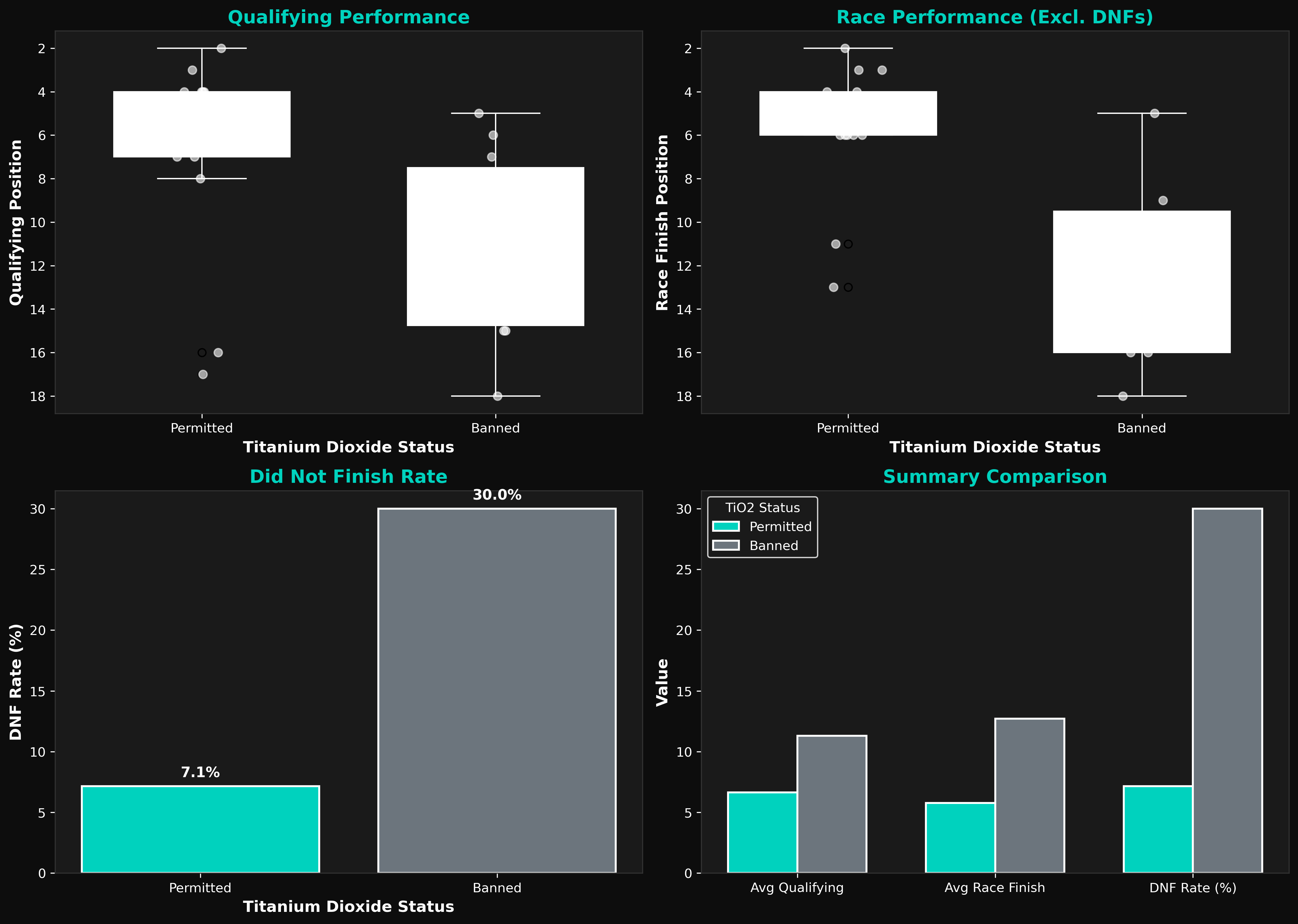In countries where titanium dioxide is permitted, Antonelli qualified with a mean position of 6.64 (SD: 4.50). In countries where it’s banned, his mean qualifying position dropped to 11.30 (SD: 4.40).