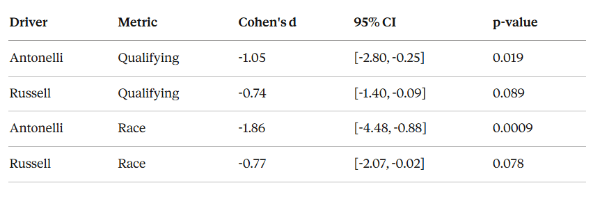 By conventional statistical standards, there is a significant association between food additive regulations and Antonelli’s 2025 performance. The effect is large, robust to non-parametric testing, and more pronounced for him than for his teammate.