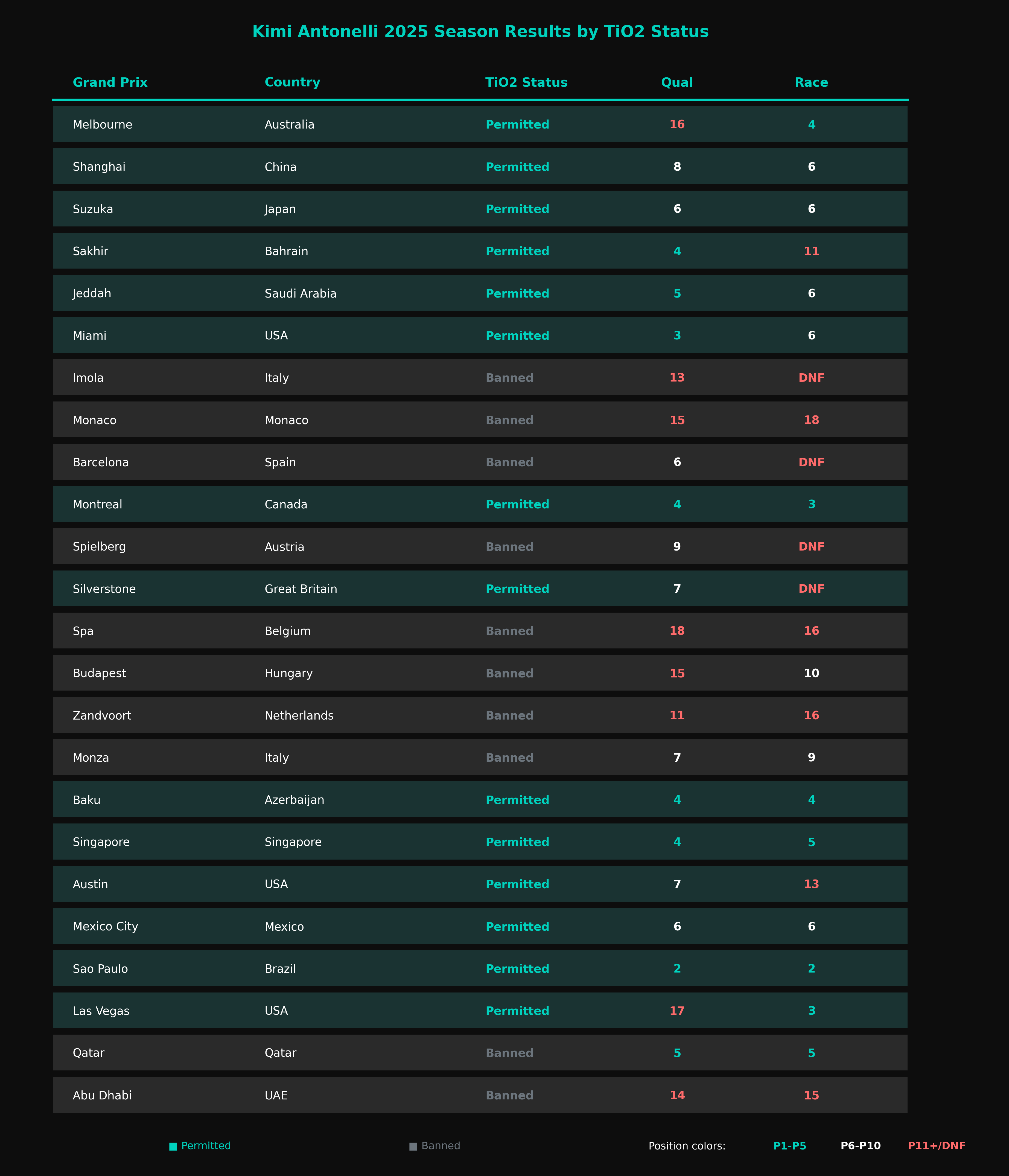 I collected Antonelli’s qualifying and race finish positions across all 24 rounds of the 2025 season, coding each venue by the TiO2 regulatory status of its host country. The sample split 14 races in TiO2-permitted countries versus 10 in TiO2-banned countries.